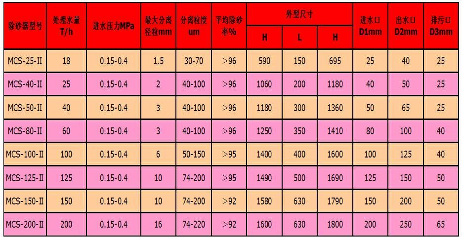 4、進水壓力 ≥0.4Mpa 5、壓力損失 0.028Mpa 6、除砂直徑 >0.8mm